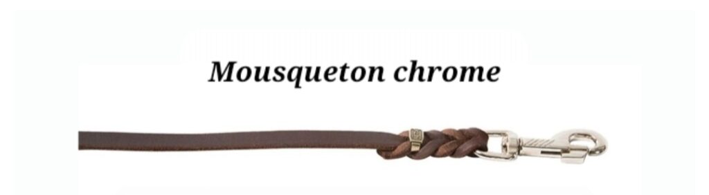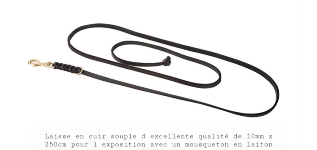 Laisse en cuir souple d’excellente qualité. Il existe différentes tailles et différentes couleurs de cuir : brun et noir. Le mousqueton existe en chrome, acier inoxydable et laiton. Il est possible d’avoir une poignée ou un noeud au bout.